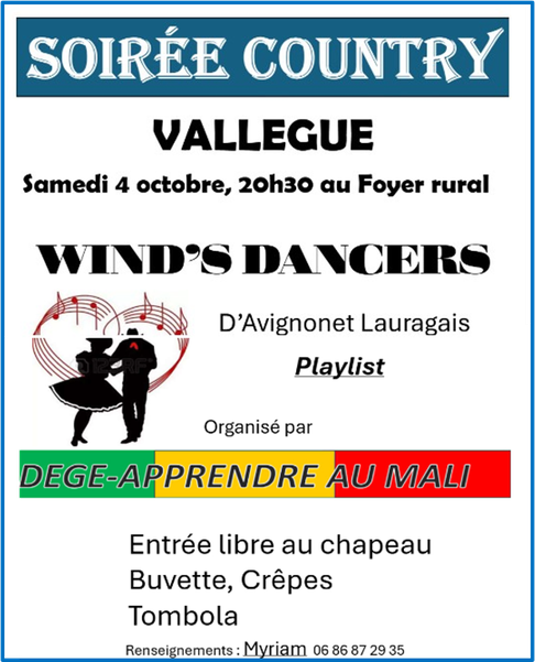 Samedi 4 octobre 21h Bal Country (playlist club Avignonet) entrée au chapeau, crêpes, buvette, tombola
